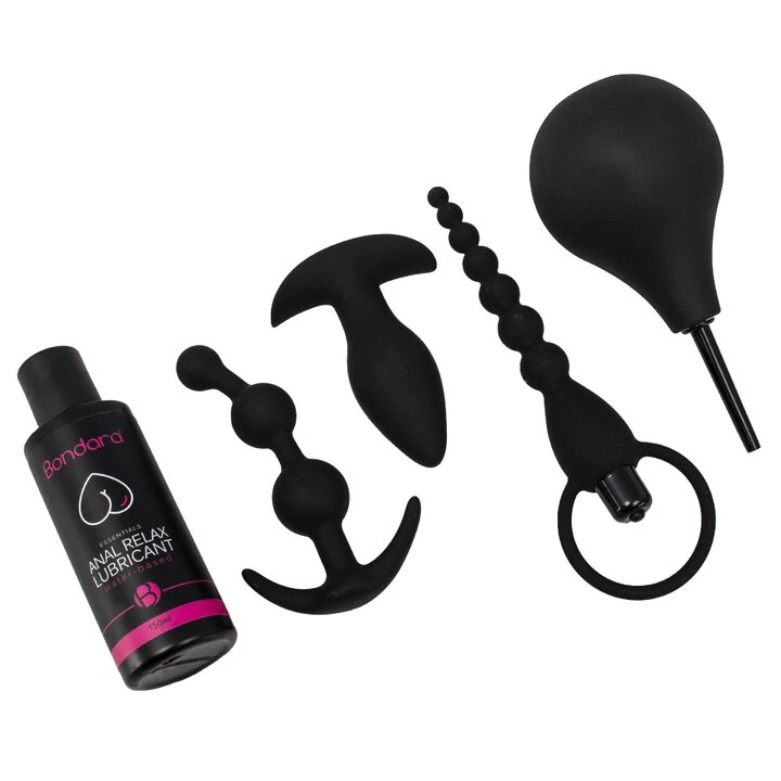 โข ย Five-piece set includes anchored anal beads, an anchored plug vibe, vibrating beads, a medium silicone douche and anal relax lubricant
