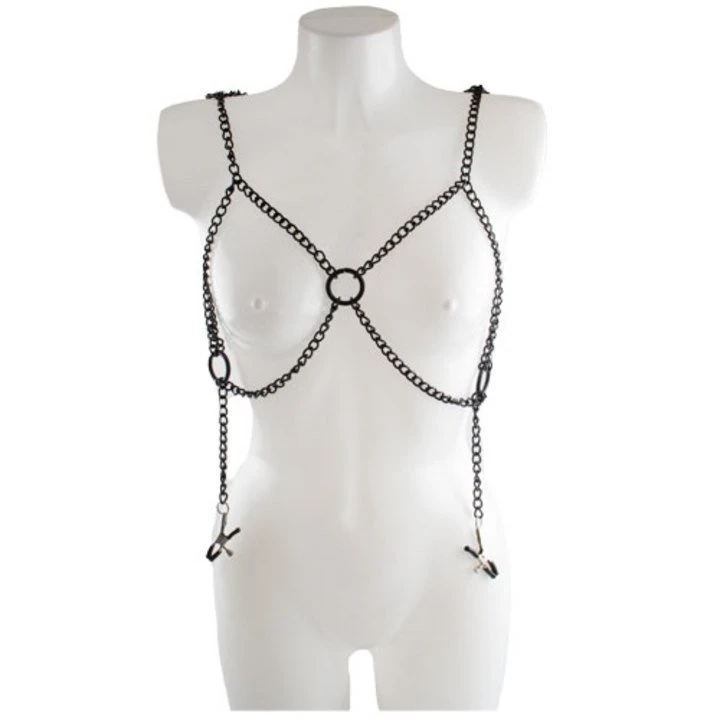 Bondage just got a whole lot sexier with the Bondara Black Chain Bra with Nipple Clamps. Made entirely from chains, the bra echoes the style of restraints to create a perfect look for bondage and power play. As two nipple clamps drape from the top of the open cups, fit them in place for an intense pinch that will drive you wild.