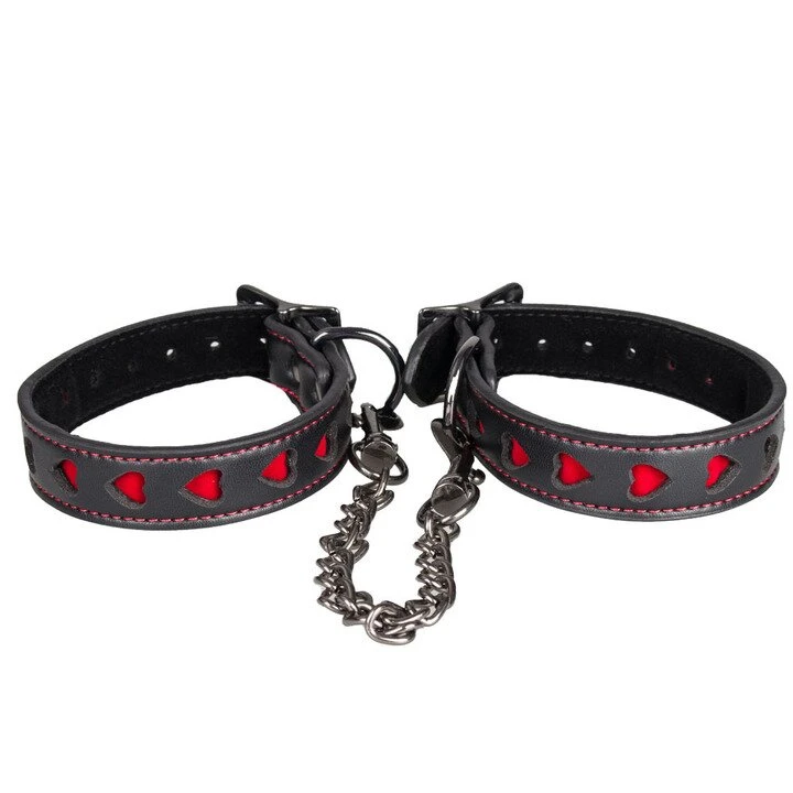 • Six matching bondage accessories tie together with heart-shaped imprints in faux leather